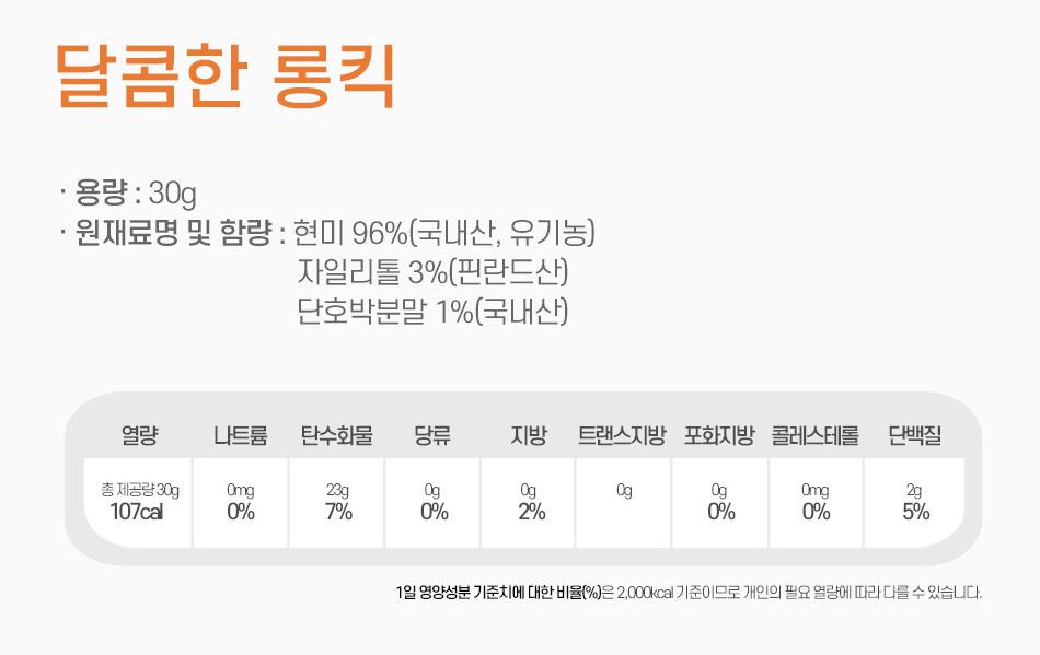 자일리톨과 단호박 분말을 첨가해 달달하지만 당류 함유 0g으로 건강하고 맛있는 과자를 만들었어요. 특히 맛 좋기로 유명한 장성에서 난 쌀을 사용해 기름에 튀기지 않고 열로 팽창시켜 만들며, 밀가루나 방부제, 합성착색료 같은 식품 첨가물을 전혀 넣지 않고 원재료만을 사용합니다.