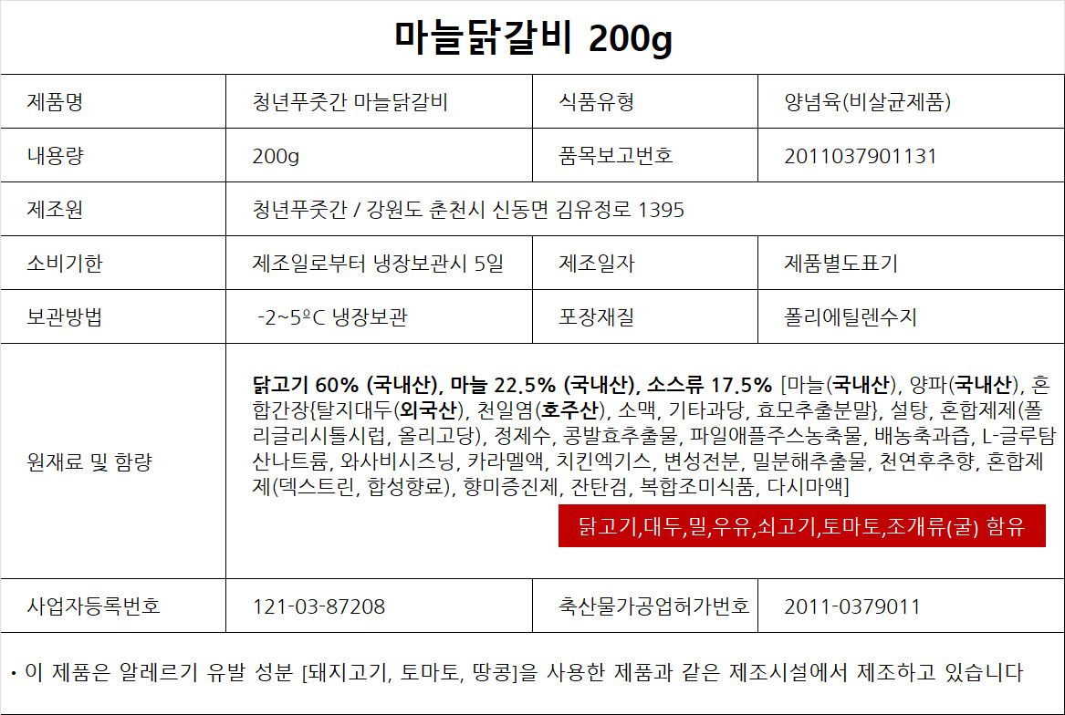 얼리지 않은 국내산 냉장육에 청년푸줏간만의 특제 간장 소스와 국내산 통마늘을 듬뿍 담아 완성한 마늘 닭갈비입니다. 탱글한 닭고기에 입안 가득 퍼지는 달콤하고 알싸한 간장 소스의 완벽 조화를 즐겨보세요. 1인 가구는 한 번에 먹기 좋고, 2~3인 가구는 여러 가지 맛을 다양하게 즐길 수 있도록 200g(약 1인분) 소포장으로 담았어요. 마늘 닭갈비 외에도 오리지널(양념), 간장, 땡초 닭갈비를 취향에 따라 고를 수 있답니다. 가장 신선하고 맛있는 춘천 닭갈비의 맛을 전해드리기 위해 당일 제조, 당일 출고의 원칙을 즐기고 있습니다. 냉동하지 않고 냉장 상태 그대로 보내드리니 집에서 춘천의 맛을 즐겨보세요.