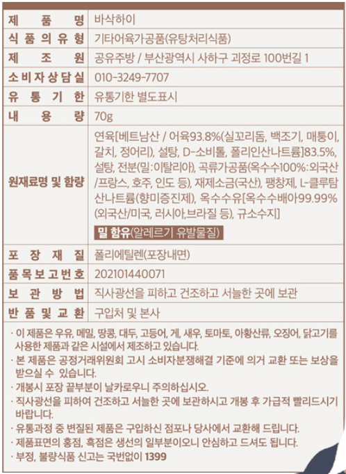 93.8%의 어육 함량 바삭하이 70g 1봉지