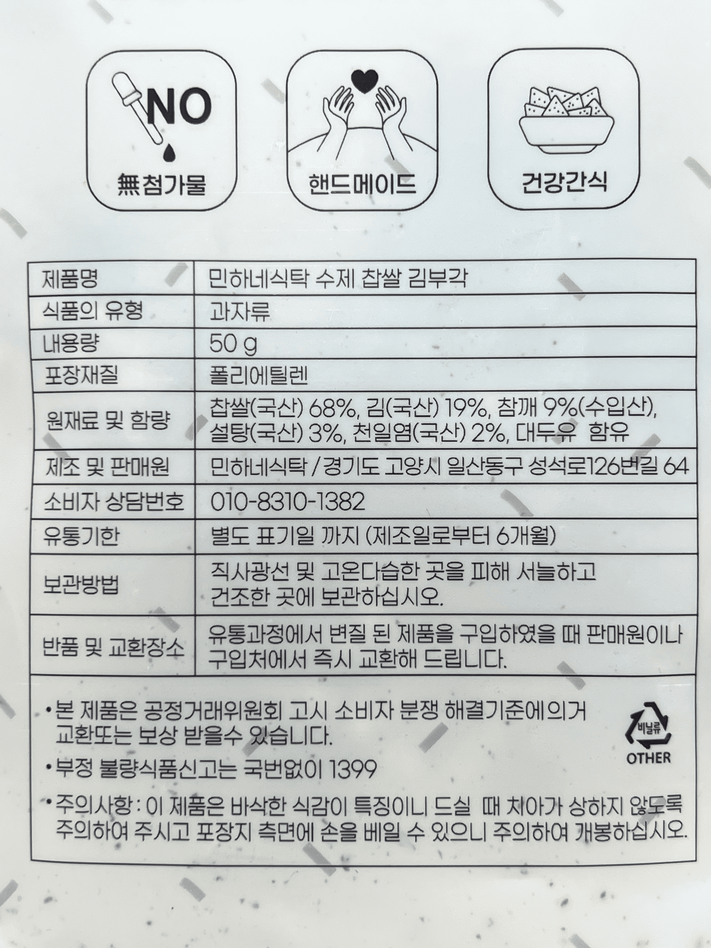 민하네 식탁 찹쌀 김부각은 시간이 걸리더라도 전통 방식으로 한 장 한 장 찹쌀풀을 펴서 바르고 있어요. 김에 진심인 대표님의 뜻에 따라 김은 맛이 가장 좋은 완도산 파래김으로 고집하고 있습니다. 김부각의 풍미와 맛에 영향을 주는 찹쌀, 참깨, 식용유는 직접 보고 최고의 재료만을 엄선하여 만들고 있습니다. 눅눅함은 이제 걱정마세요. 김부각의 특성을 고려한 개별 지퍼백 포장으로 바삭한 김부각을 즐겨보세요.