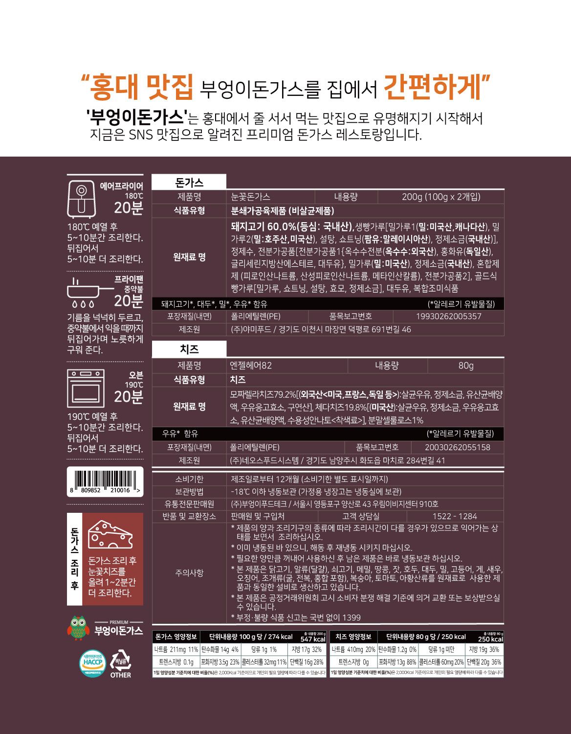 고소한 눈꽃 치즈를 뿌린 눈꽃치즈돈까스는 부엉이돈가스의 시그니쳐 메뉴입니다. 저온 숙성 과정을 거쳐 육즙이 가득 담긴 100% 국내산 등심으로 조리한 돈가스와 모짜렐라&체다치즈를 동봉해 보내드리니, 조리한 돈가스 위에 치즈를 뿌려 완성해 주세요. 2가지 치즈는 모두 국산만을 사용해 고소한 치즈 본연의 맛을 잘 느낄 수 있고, 부족함 없는 넉넉한 양으로 만족스러운 경험이 될 거예요. 치즈 덕후라면 꼭 도전해 보세요!