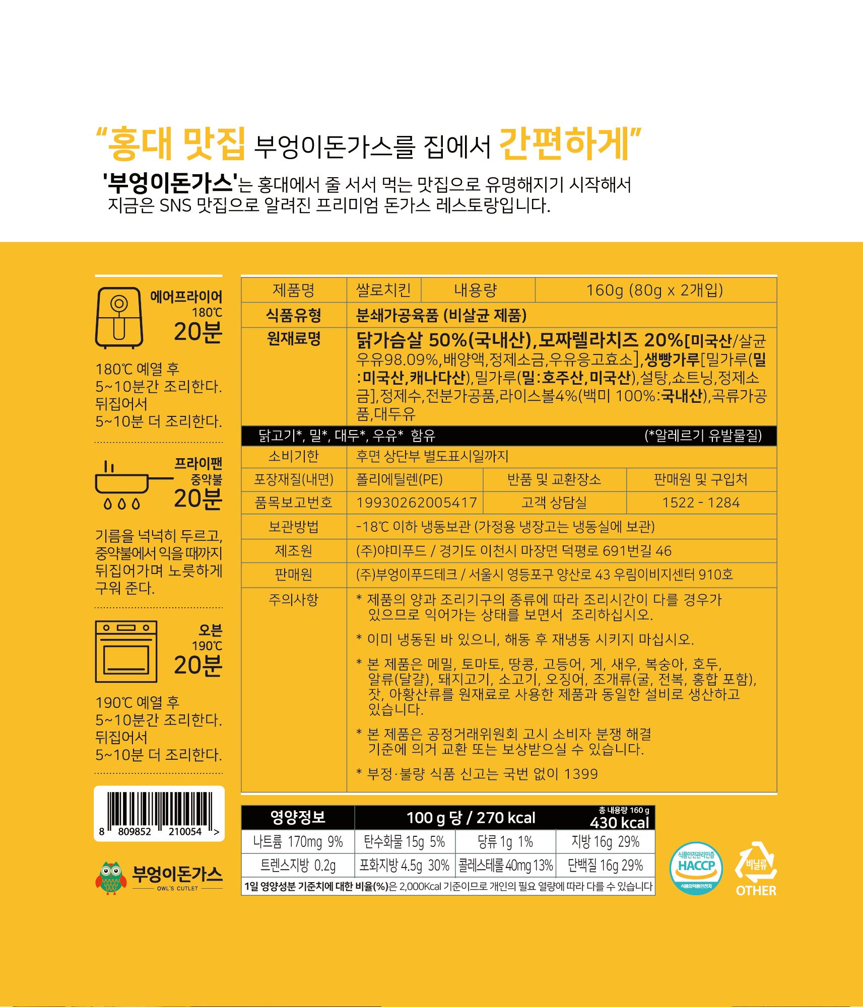 돈까스 명가 부엉이 돈까스에서 처음 선보이는 치킨 메뉴입니다. 국내산 냉장 닭가슴살에 쌀로 만든 라이스볼과 자연산 모차렐라 치즈를 듬뿍 넣어 만들었어요. 겉은 바삭, 속은 촉촉한 겉바속촉 제대로 즐길 수 있답니다. 안전하고 깨끗하게 보내드리기 위해 HACCP 인증 시설에서 제조하고 있어요. 에어프라이어로 20분이면 조리가 가능하니 닭가슴살 대신 샐러드 위 토핑으로, 안주로, 반찬으로 다양하게 즐겨보세요.