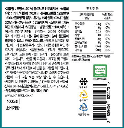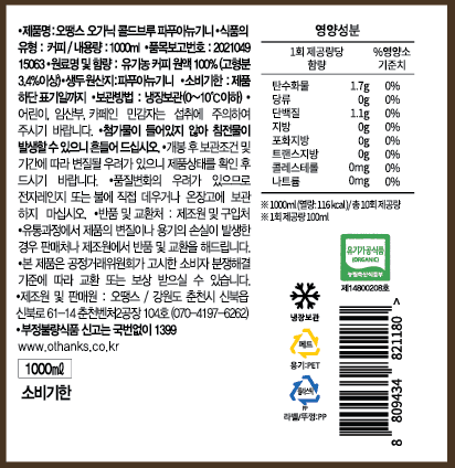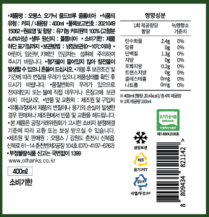 차가운 물 또는 저온에서 장시간 우린 커피를 콜드브루라고 하죠. 오땡스 콜드브루는 원두 가루 위에 물을 한 방울씩 떨어뜨려 장시간 동안 커피 성분을 추출하는 점적식 추출 방식으로 추출해 만들고 있습니다. 티백 커피를 우려내듯 원두 가루와 물을 한꺼번에 담가놓고 우려내는 침출식에 비해 맛이 진하고 풍미와 향이 살아 있는 것이 특징이에요. 유기농 원두로 첨가물 없이 깔끔하게 완성한 콜드브루를 즐겨보세요.