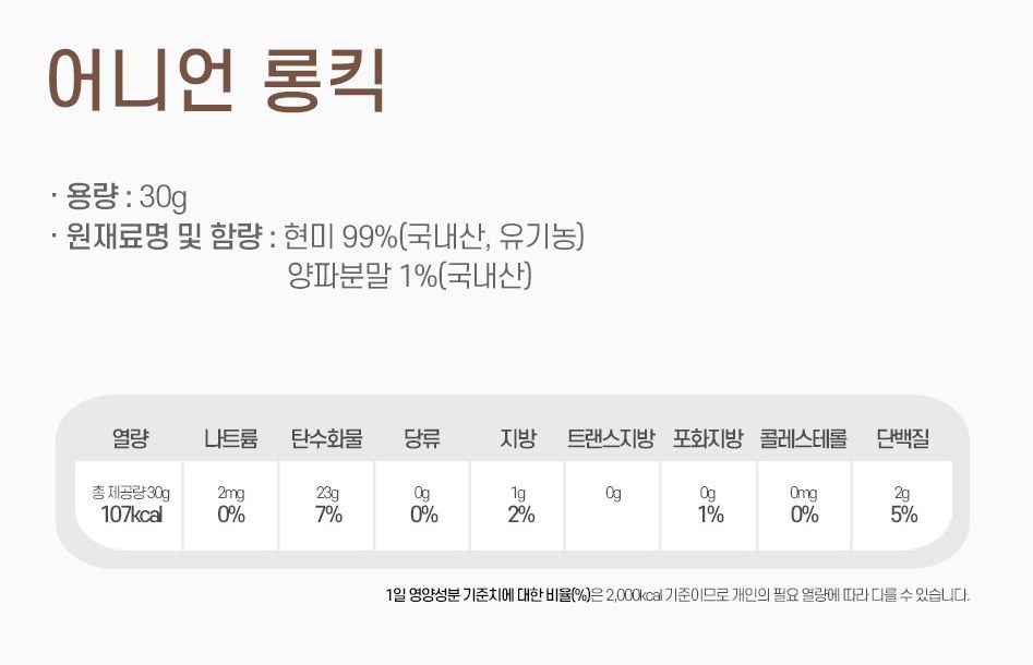 국내산 유기농 현미와 국내산 양파 분말을 담아 건강하고 맛있는 과자를 만들었어요. 특히 맛 좋기로 유명한 장성에서 난 쌀을 사용해 기름에 튀기지 않고 열로 팽창시켜 만들며, 밀가루나 방부제, 합성착색료 같은 식품 첨가물을 전혀 넣지 않고 원재료만을 사용합니다.