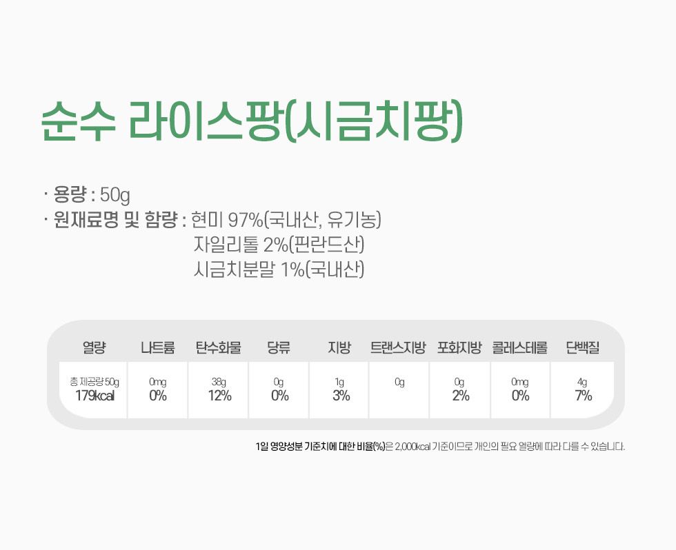 "기름에 튀기지 않고 현미를 열로 팽창시켜 만들었어요. 국내산 유기농 현미 100%에 쌀눈을 더해 더욱 고소하답니다."